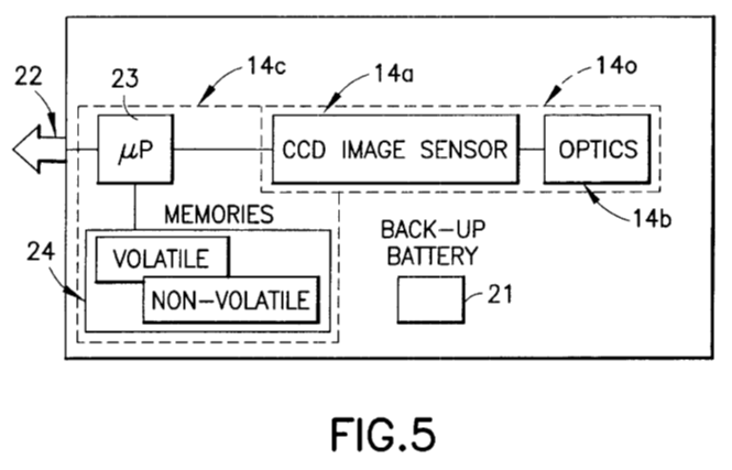 Samsung argued that all of the components in FIG. 5 of the ‘078 patent should be the components of the camera unit 14. Samsung mainly relied on a portion of the ‘078 patent that states, “the structure of both camera card 15 and camera unit 14 conforms to the block diagram shown in FIG. 5.”5 The specification of the ‘078 patent also refers to FIG. 5 as a block diagram of the camera unit. However, the Federal Circuit noted that FIG. 5 used the same numbering convention for the components of the camera unit 14 as the other figures and the specification. The other components in FIG. 5, such as the battery 21 and the interface 22, are not associated with the numbering convention that uses the number 14.